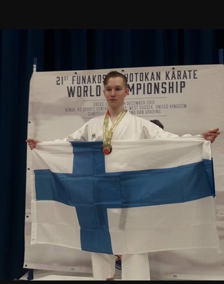 Julius Nyholm voitti hienosti kultaa Lontoossa 12.-15-12.2019 pidetyissä FSKA tyylisuunnan MM kisoissa sarjassa kata miehet 18-21v mustat vyöt. Juliuksen katat olivat Kanku Sho ja Unsu. Julis voitti finaalin pisten 25,4. Hopeaa sai Englannin Algie Cunnungham pistein 25.2 ja pronssia Claus Enckell Kirkkonummelta pistein 24.9.